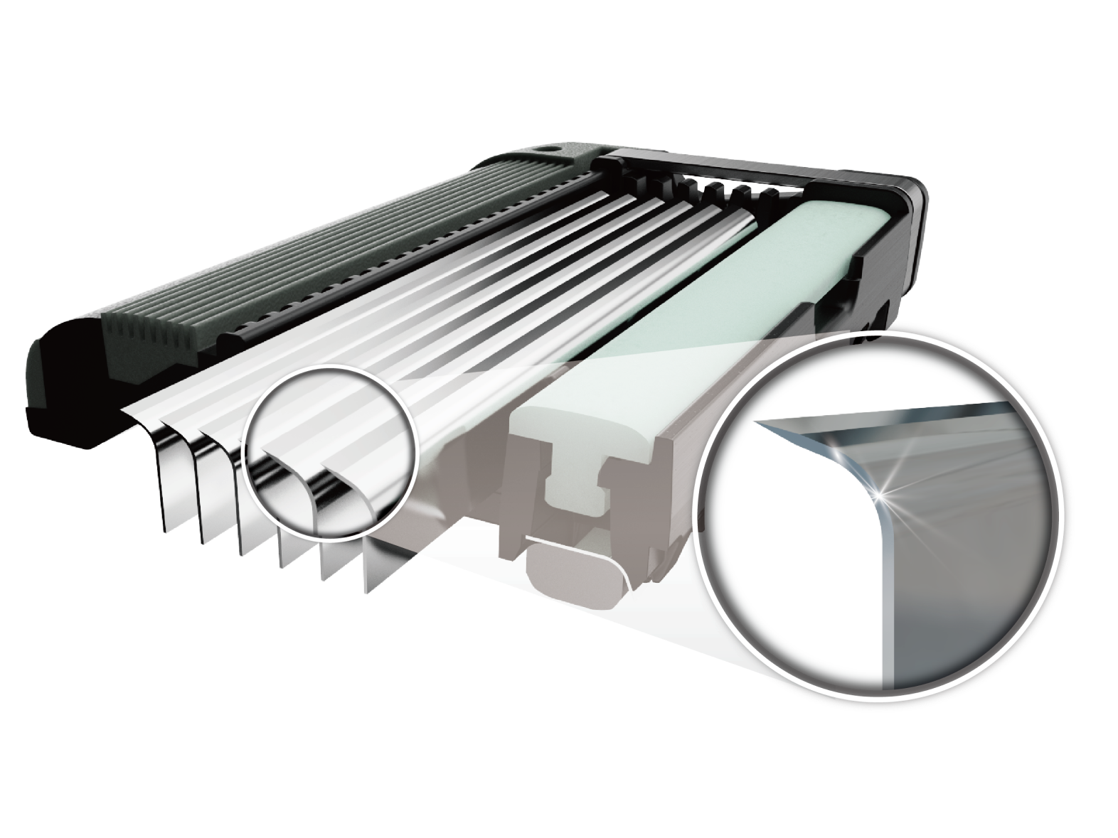 بفضل تسنين شفراتنا على شكل زاوية، يمكننا وضعها بالقرب من بعضها البعض بشكل كبير. والسبب في اتباع هذه التقنية بسيط: فكلما كانت المسافات بين الشفرات أضيق، كلما قلّ تأثيرها على البشرة. لذلك يمكنك أن تستمتع بحلاقة أكثر أماناً وراحة مع أقل تهيّج للبشرة.